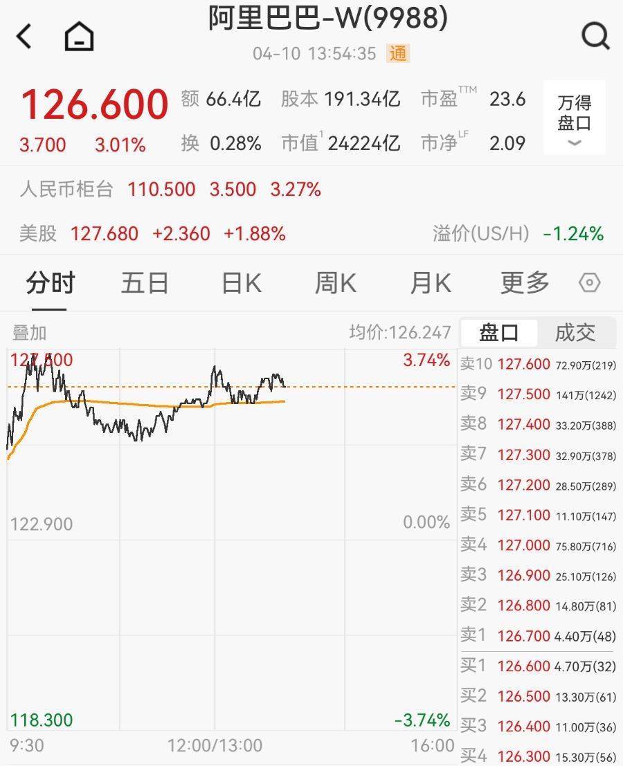 截至4月10日13:54,阿里巴巴股价涨超3%,报126.6港元/股,总市值为2.42万亿港元。