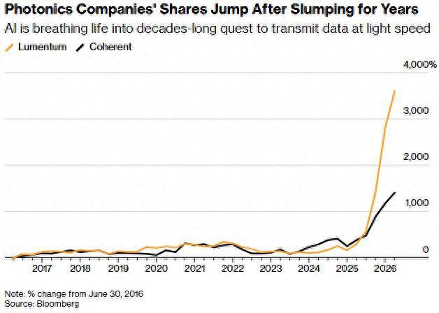 该公司与竞争对手 Coherent 一起,上个月获得了来自英伟达的 20 亿美元投资。Lumentum 供应先进的磷化铟器件,旨在实现高速数据传输。随着光电子技术越来越多地出现在云计算集群中,其在纳斯达克交易的股票在过去一年中上涨了 1500% 以上。