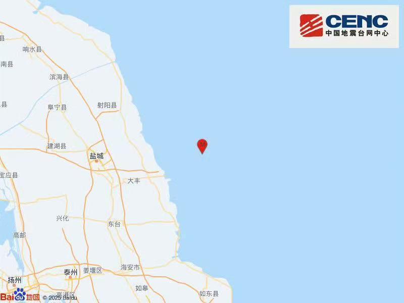 中国地震台网正式测定:10月2日8时27分,在江苏盐城市大丰区海域(北纬33.43度,东经121.13度)发生3.4级地震,震源深度12公里。